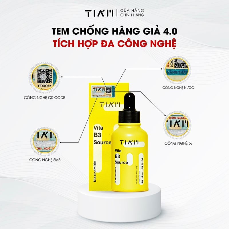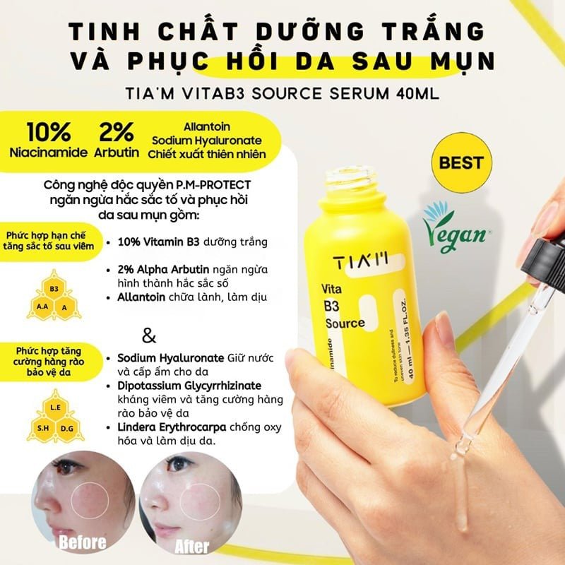 - Serum Tiam Tinh Chất Dưỡng Trắng Da, Phục Hồi Da Sau Mụn Tiam Vita B3 Source Serum là tinh chất dưỡng thuộc thương hiệu Tiam đến từ Hàn Quốc. Với 10% Vitamin B3 (Niacinamide) và 2% Alpha Arbutin giúp cải thiện da nhanh chóng các vấn đề về sắc tố như thâm sạm, không đều màu, đặc biệt giảm thâm và hỗ trợ phục hồi da sau mụn.